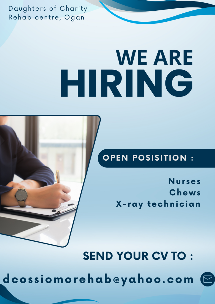 WE ARE HIRING: Nurses, Chews and X-ray Technicians are needed urgently. Send your CV to dcossiomorehab@yahoo.com
